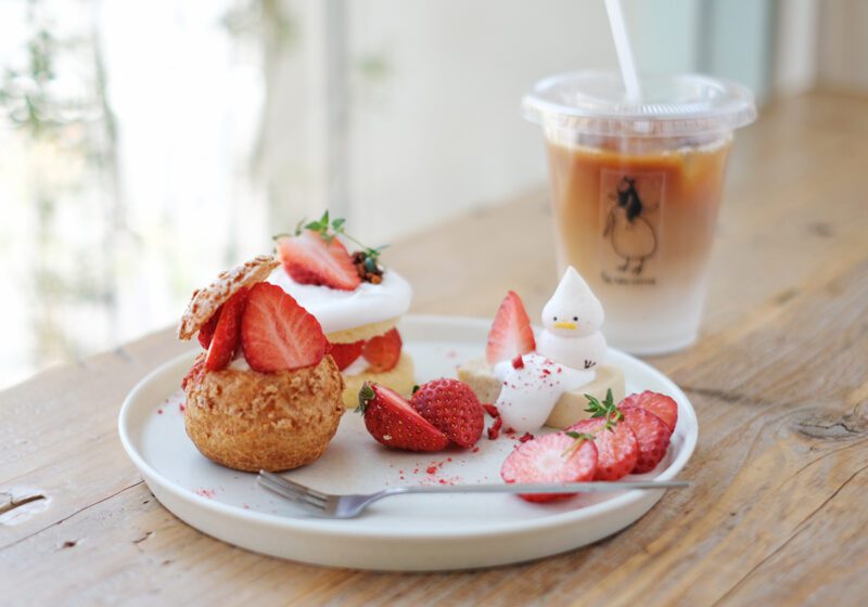 オーナーは各地で店舗設計を手がけた建築士で、理想のカフェを自ら形にしました。木の温もりとグリーンが調和した店内はナチュラルで落ち着いた雰囲気。ショーケースにはタルトやシュークリーム、チーズケーキなど、旬の素材を使ったスイーツが並びます。特に人気なのは季節限定の「デザートプレート」。春の「いちごプレート」には福岡県産あまおうを使った3種のいちごスイーツが盛り付けられ、見た目も華やかです。