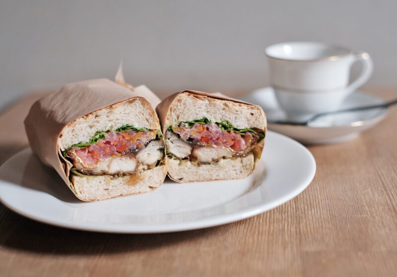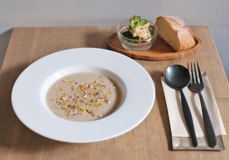 フランスでの暮らしや料理店での経験を活かしたメニューが魅力で、看板メニューの“カスクルート”はフランス版サンドイッチ。「サバサンド」や「パテドカンパーニュ」など、ひと皿の料理として楽しめる内容です。クミンやコリアンダーを効かせたサバとマリネ野菜を自家製パンで挟んだ「サバサンド」は、酸味や甘味、香りが絶妙に調和します。一緒に提供されるスープの内容はその日によって異なり、この時はマッシュルームのスープでした。こちらも丁寧に作られていることが感じられる深みのある味わい。