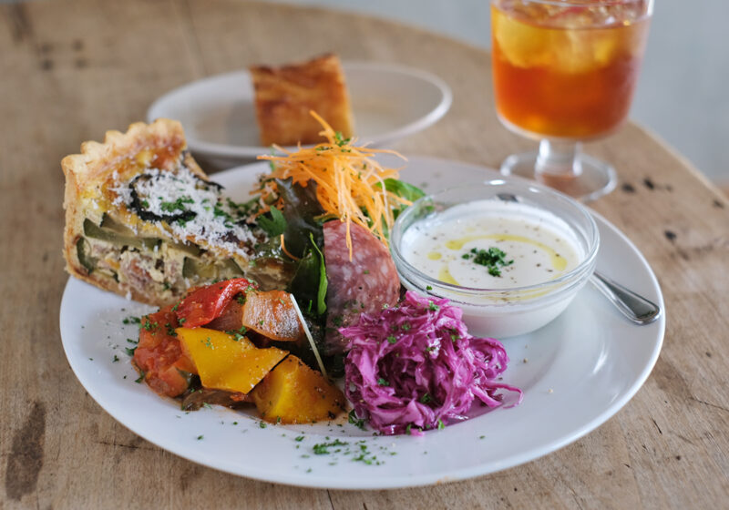 月替わりのランチ(1,980円)は旬の素材を活かしたメニューで、2025年6月は「自家製サルシッチャとズッキーニのキッシュ」。地元・糸島や実家の無農薬野菜を使い、ラタトゥイユやサラダ、スープなども丁寧に手作りされています。