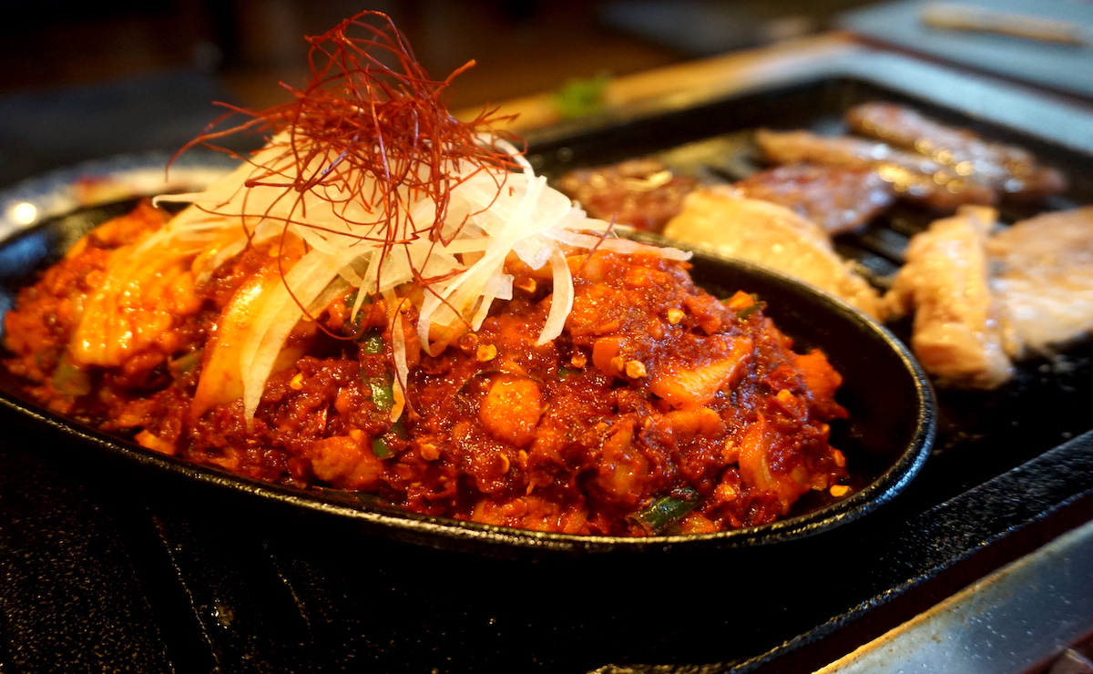 メニューでは、リニューアルを機に登場した鉄板焼きメニューが評判上々。なかでも新たな名物として打ち出した「地獄焼き」(2人前1480円/注文は2人前〜)は注目です! 大ぶりのシマチョウを主役にピリッとくる辛味ダレ、スライスニンニクの風味をガッツリと効かせたメニューで、鉄板ごと焼き台にのせれば10分ほどで完成。2種類をブレンドした韓国唐辛子の辛さが味の決め手で、焼いている間も漂う刺激的な香りに食欲がそそられます。