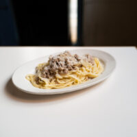 続いていただいたのは、リピーターが多い人気メニュー「ゴロゴロ肉のボロネーゼ」(2,100円)。炭火焼きで使用する際に仕入れた塊肉をカットした際に出る、すじや細かい肉を使った、田上さんいわく「しっかり肉を食らう」ボロネーゼです。レバーやベーコン、キノコなども加えることで、香りとコクが混ざり合い、濃厚で複雑な味が楽しめる大人味。ワインとの相性も抜群です。