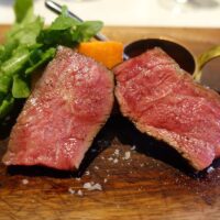 肉料理は嘉麻市の赤崎牛イチボのロースト。低温調理でベストな食感を得た極上肉は、これまた素晴らしいソース(フォン・ド・ボーと名古屋コーチンの出汁を煮詰め、マスタード、粒マスタード、ニンニクオイルを合わせて作る)をまとって完璧の域に達します。豊かな旨味と歯応えは快楽そのもので、これは今年食べた肉料理でもベスト級の美味しさ!