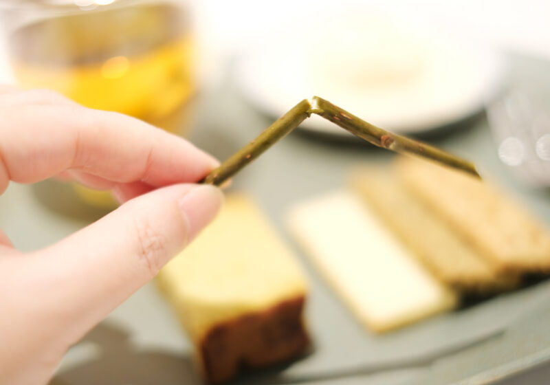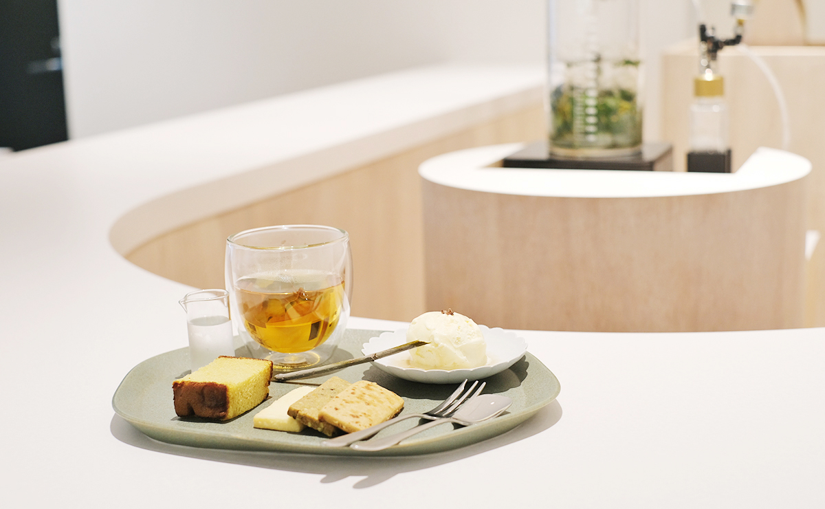 抽出されたフローラルウォーターは喫茶スペースで提供する「フローラルドリンク」で楽しむことができます。おすすめはお菓子とセットになった「フローラルドリンクとスイーツのセット」(2,200円)。フローラルドリンクは素材の組み合わせや香り、味わいのバランスを考慮しながら開発しているそうです。季節に合わせて内容が替わり、この日は用意された3種から「芳樟とカモミールの八女紅茶」のホットを選びました。