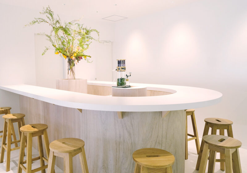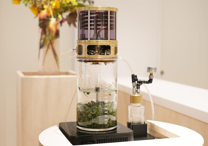 店内の奥には「香りのおみやげ喫茶。」をテーマとする喫茶スペースが設けられています。U字型のカウンターの中央で存在感を放っているのは、植物から“フローラルウォーター”を抽出する蒸留器。水と植物を煮立たせて、蒸気を冷やしながらフローラルウォーターを集める様子はまるで実験のようで見ていて楽しいですね。