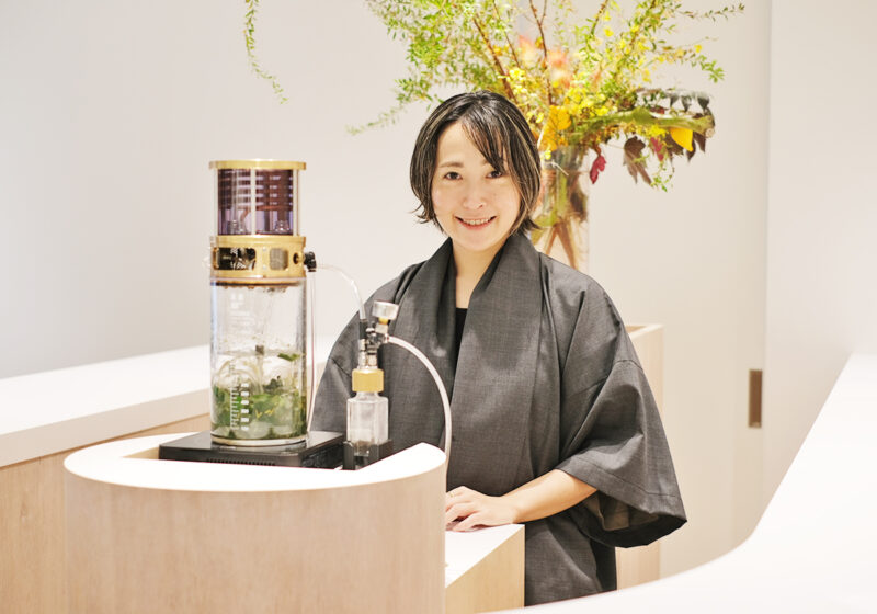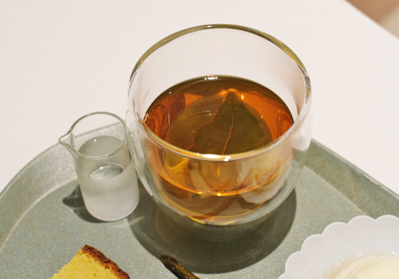 ベースとなるお茶は、八女市「中村園」の無農薬のカモミールと和紅茶のブレンド。そこにアルコールを揮発させた白ワインシロップが加えられ、甘みと深みを足しています。そのままでも十分においしいのですが、鹿児島県の開聞岳のそばにある日本最古のハーブ農園「開聞山麓 香料園」で育った「芳樟」から抽出したフローラルウォーターを加えると、味わいが一変。ぎゅっと凝縮された植物のフレッシュな香りが口いっぱいに広がり、これまでに味わったことのないおいしさを楽しめました。