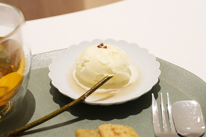 スイーツプレートのアイスクリームはモクレン科のニオイコブシのシロップをかけたもの。華やかな香りのシロップがまろやかなアイスクリームのおいしさを引き立てていて、こちらも新感覚のおいしさでした。添えられたニオイコブシの枝をポキッと折って香りを嗅ぎながらいただくのも楽しい演出です。