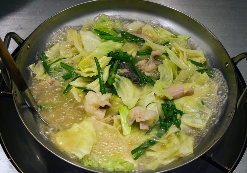 主役の「もつ鍋」は、キャベツとニラをたっぷりとのせ、鶏ガラベースのスープで炊き上げます。煮立った頃にスタッフが鍋を混ぜ、上にのせた餃子の皮がとろりと溶けた瞬間が食べ頃。火加減や混ぜ方は各テーブルのスタッフが担当するため、初めて訪れる人でも安心です。