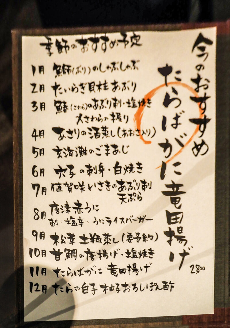 加えて、旬食材を使った季節のおすすめ料理も見逃せません。今年の11月から冬にかけては、10年以上ぶりに復活した人気メニュー「たらばがにの竜田揚げ」(2,800円)がお目見え。「生、焼き、しゃぶしゃぶもありきたり……」と考えた末に生まれたというこの逸品、厨房で揚げている時からとにかく香りがすごいんです。香りだけで飲めます!