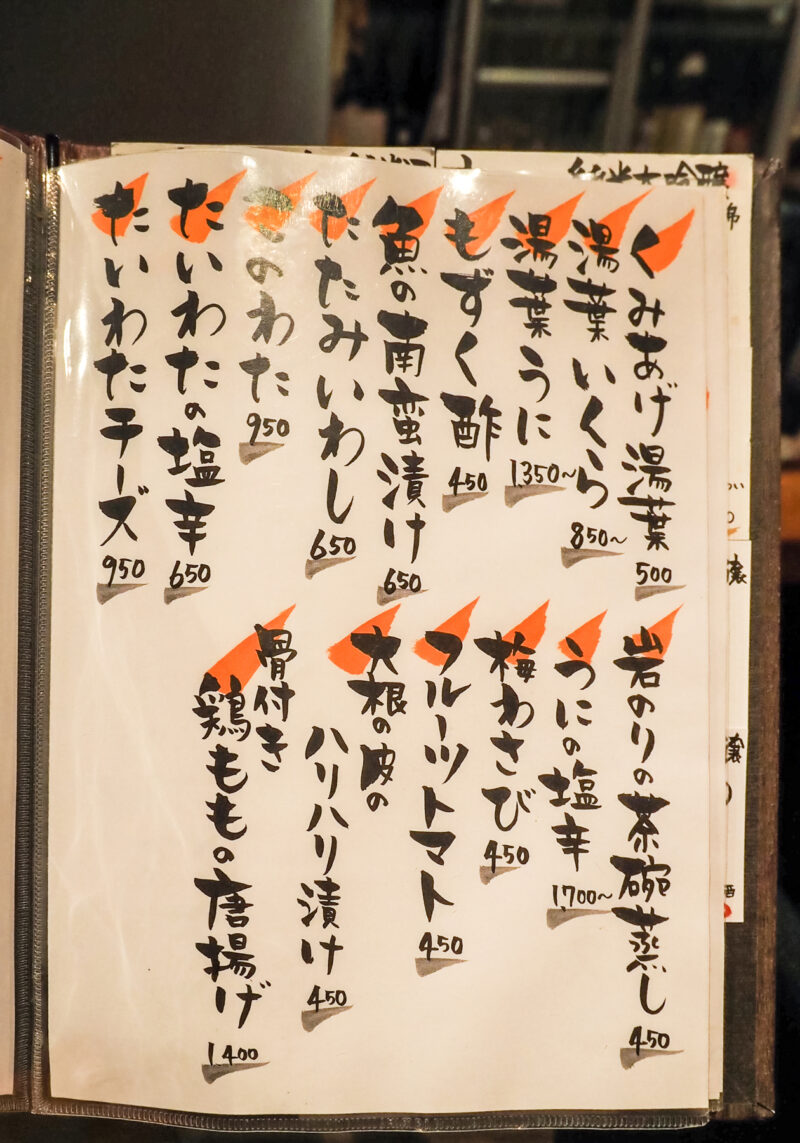 殻付きのタラバガニは特製の漬け地に10日間ほど漬け込んでから揚げているので、しっとりふっくら。表面は香ばしいのに蟹の汁が滴るほどジューシーで、焼きとも天ぷらとも違う鮮烈な味わいです。常連さんの「あの味が忘れられない」という声から復活を果たしたそうなのですが、その言葉に納得。確かにこの「肴」は、左党の心に深く刻まれる名品だと思います。