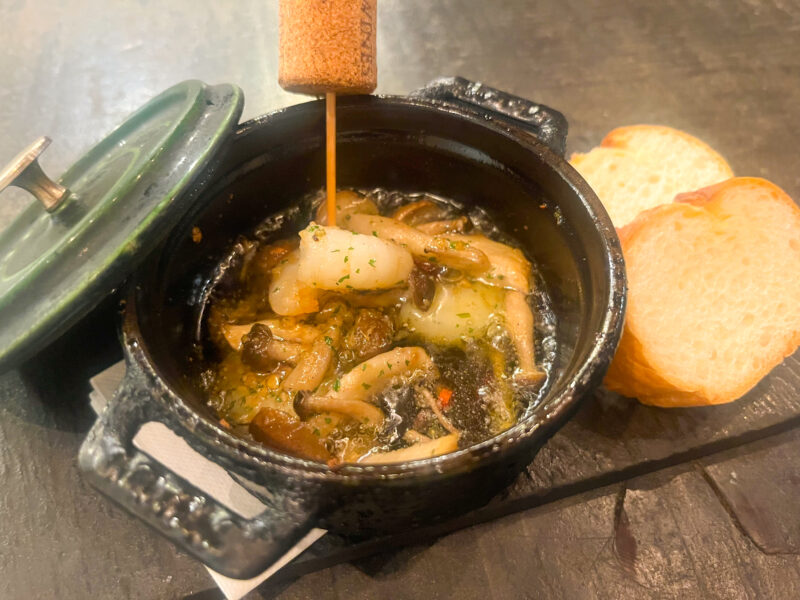 次は、ガーリックが香るアツアツの「エビとキノコのアヒージョ」(写真は1人前)が登場。オリーブオイルと唐辛子だけでなく、10種のスパイスがブレンドされて後味はピリッとスパイシー。プリプリのエビとキノコは噛むほどに旨味が広がり、ワインがぐいぐい進んでしまいそう!