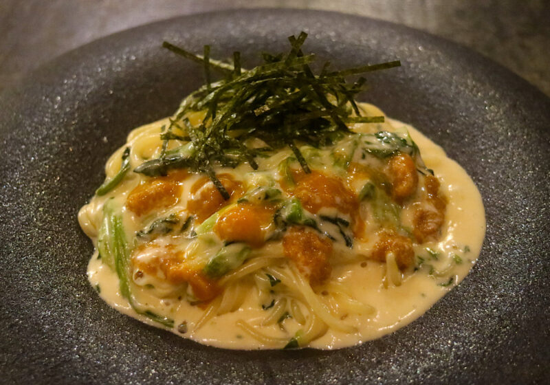 そして、たっぷりのウニを使用した名物「うにクリームパスタ」がお目見えです。もちもち食感の生麺に絡まるクリームソースにもウニペーストを使った贅沢なパスタで、ウニの濃厚な甘みを堪能できます。ほうれん草、海苔の風味とも絶妙に調和し、アツアツの香りと旨味が口っぱいに広がります。