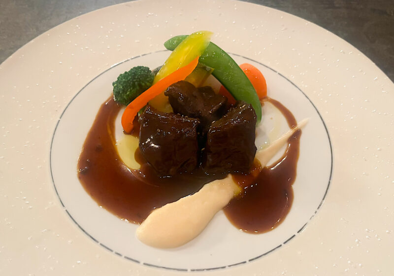 メインの肉料理は「牛タンの赤ワイン煮込み」。名店仕込みの手間を惜しまない工程で、1日漬け込み、1日煮込んで、1日冷まして…と3日間かけて仕上げた逸品です。やわらかく煮込んだタンは口の中でほろりとほどけ、赤ワインとトリュフオイルが豊かに香る、思わずうっとりしてしまう味わいです。