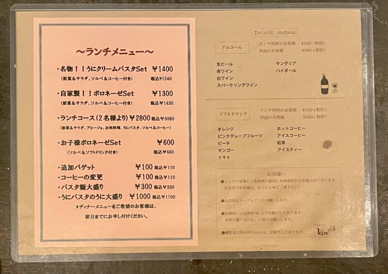 ランチタイムには、「うにクリームパスタセット」(1,540円)、「ボロネーゼセット」(1,430円)などのお得なセットもラインナップ。これからの季節は、クリスマスや忘新年会のコースも用意されています。落ち着いた雰囲気で気軽に食事を楽しめる「洋食ワイン Vin」。赤坂エリアのランチにおすすめしたいお店です。