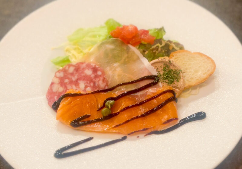 まずサーブされたのは、前菜とサラダを盛り付けた一皿。酸味の効いたバルサミコソースで味わう自家製モークサーモンはさっぱりといただけて、食欲を一気に刺激します。ふわっとなめらかな鶏レバーのムースのようなパテ、生ハム、フランス産サラミも添えられています。