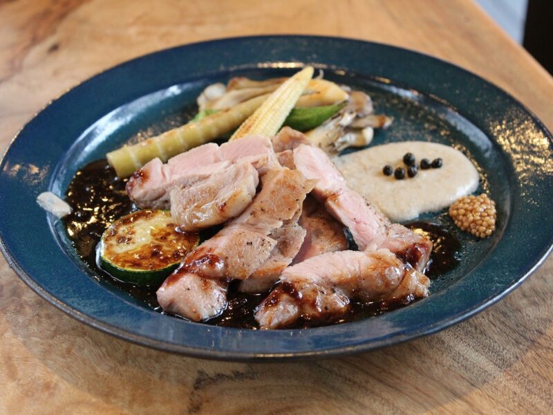 メインは「きなこ豚のロースト キノコソース&いちぢくの赤ワインソース」に。きのこソースといちぢくの赤ワインソース、さらにマスタードの3つを少しずつ付け替えながら味わうと、豚の甘みと香りがさまざまに表情を変え、ワインも進みます。