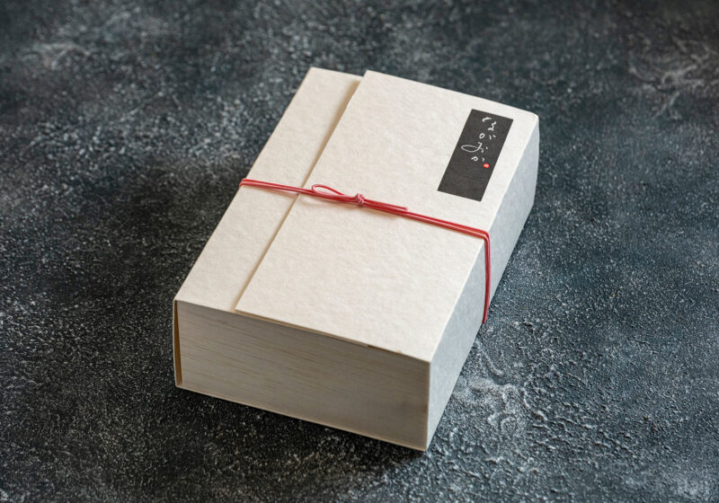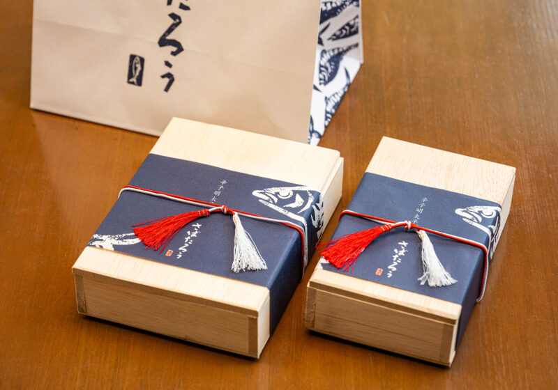 「藁焼 みかん」「赤坂こみかん」では「自家製拓ちゃん明太子」、「さばたろう」では「さばたろう自家製明太子」として販売されていますが、明太子の中身と桐箱は同じ。包装がそれぞれ異なります。「藁焼 みかん」「赤坂こみかん」はみかん柄の包装紙、「さばたろう」の方には紺色の掛け紙と紅白の房紐があしらわれ、専用の紙袋もおしゃれ!