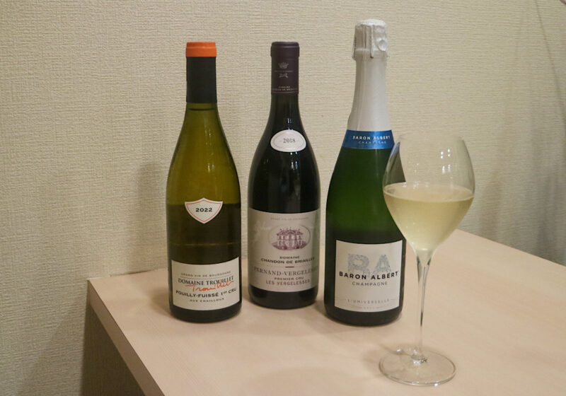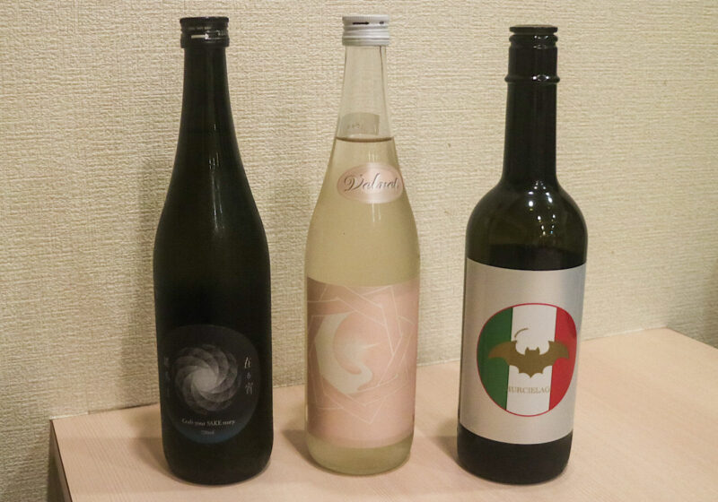 ワイン(写真左)は、フランス産を中心にクラシックでしっかりしたものをセレクト。希少な銘柄が揃う「石井商店」からも仕入れているそう。さらに日本酒(写真右)も常時5〜6種あり、ワインボトルのようなおしゃれな日本酒も。福岡・田川の天郷醸造所「在る寒夜」、佐賀の基山商店「Velvet」、京都の白杉酒造によるリゾット米でつくる「ムルシエラゴ」など、どれも気になるラインナップでした。