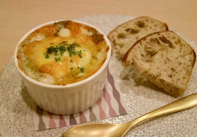 サイズ感が嬉しい「ミニグラタン」(550円)もぜひものです。「ブルーチーズのトッピング(+100円)もできますよ」の声に誘われてお願いしたところ、これが大当たり。なめらかなベシャメルソースにブルーチーズの濃厚な塩みと香りが加わり、ワインとの相性がグッと深まります。ゴロッと入ったエビに満足感もたっぷりです。
