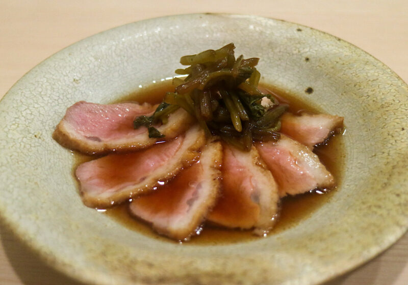 次にお願いした、「鴨と茎わさび」(880円)は、治部煮をイメージした一品。「本来は鴨のそぎ切りをしゃぶしゃぶのように煮る料理なのですが、それだと固くなってしまうので」と、戸高さんはあえてブロック肉のまま鴨肉を焼くことで、しっとり柔らかく仕上げています。