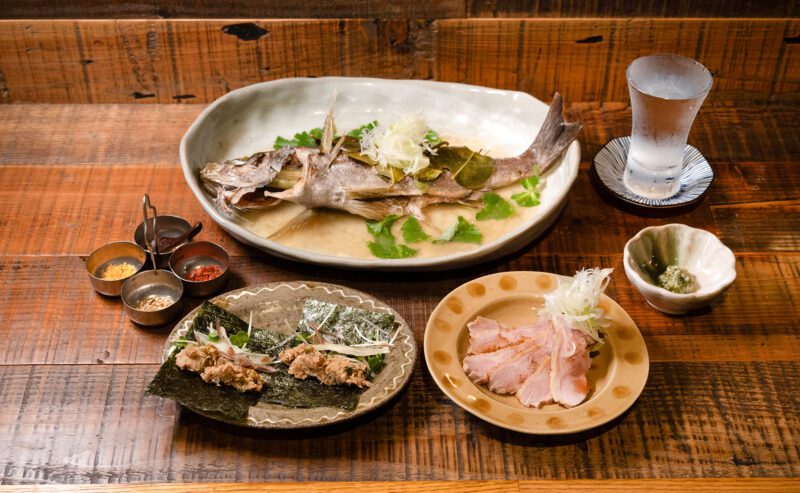 刺身盛り合わせ1人前1,300円、じでんの豚バラ串400円、ハーブ豚足焼2本780円、マグロの塩トリッパ850円、スパイス海老餃子600円、トムヤム唐揚げ750円、鴨たたき800円、魚介 坦々麺850円、スパイスおにぎり、濃厚あら出汁みそ汁各250円